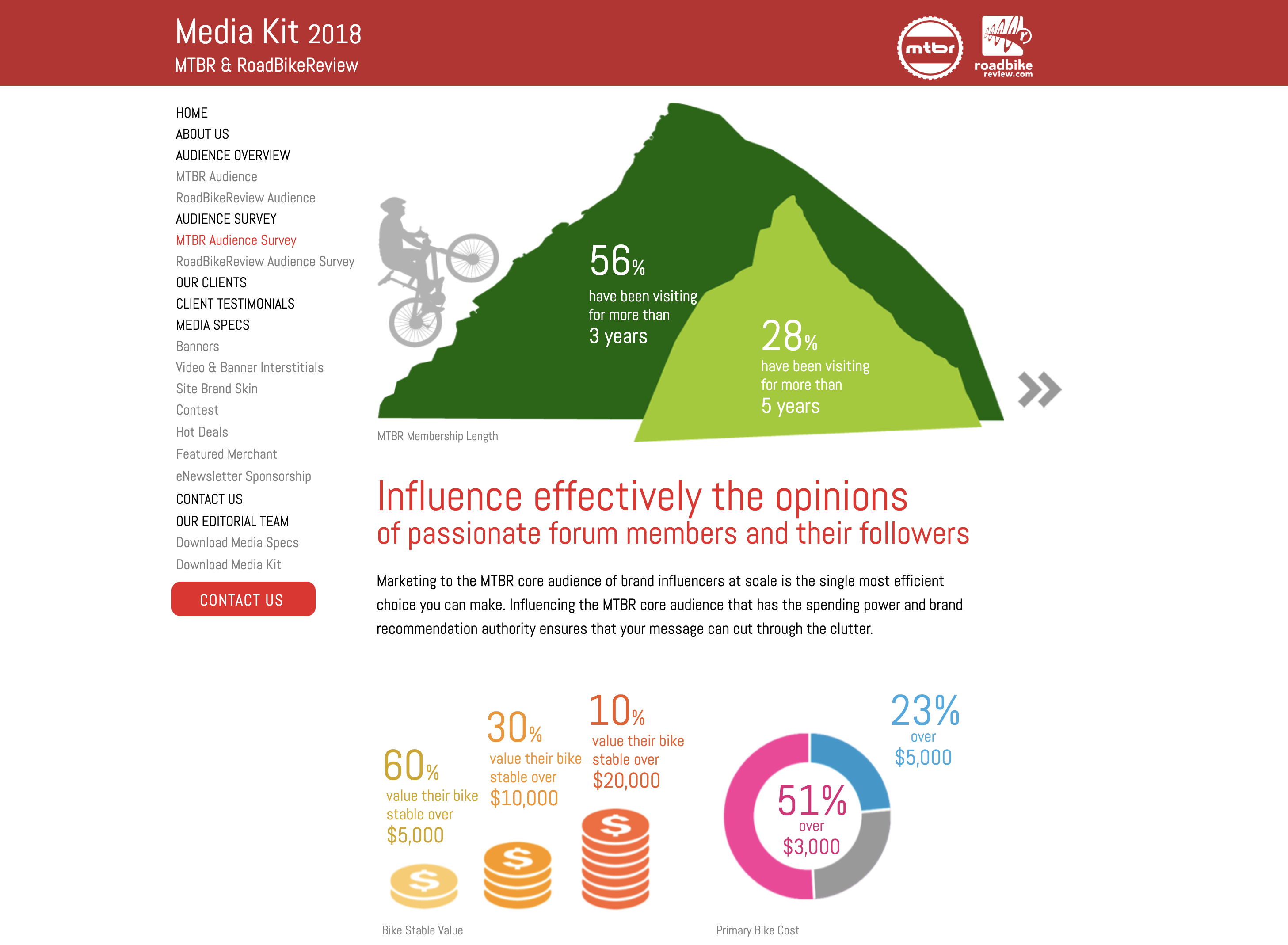 MTBR website offers marketers access to the largest audience of North American mountain bike enthusiasts, reaching more than 3.6 million mountain and road cycling enthusiasts monthly.